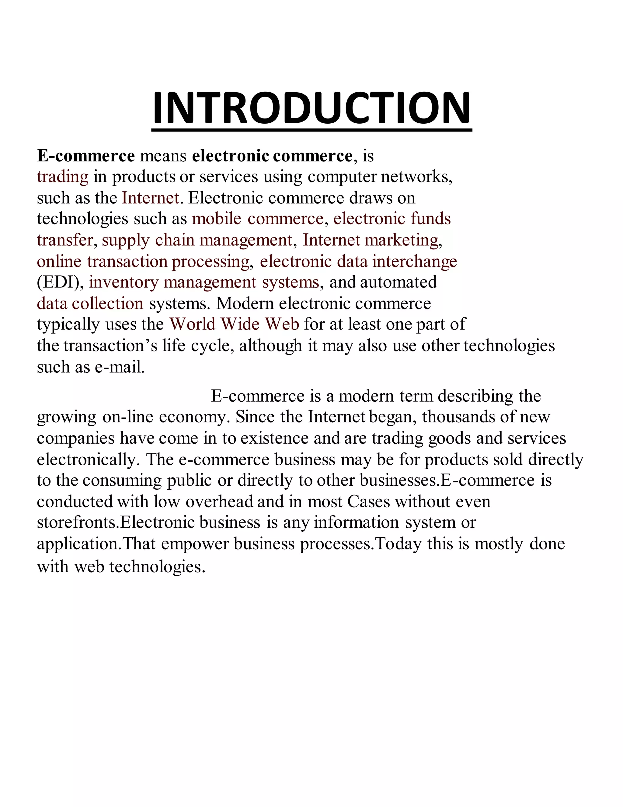 The document discusses e-commerce and its relevance in the modern world. It begins by defining e-commerce as trading products or services using computer networks and technologies like the internet. It then discusses different types of e-commerce including business to business, business to consumer, business to government, consumer to consumer, and mobile commerce. The document also outlines advantages like lower costs, higher margins, and better productivity, as well as disadvantages such as security issues, need for scalable systems, and lack of personal interaction. It concludes by emphasizing the importance of e-commerce management skills and training for business success in today's digital era.