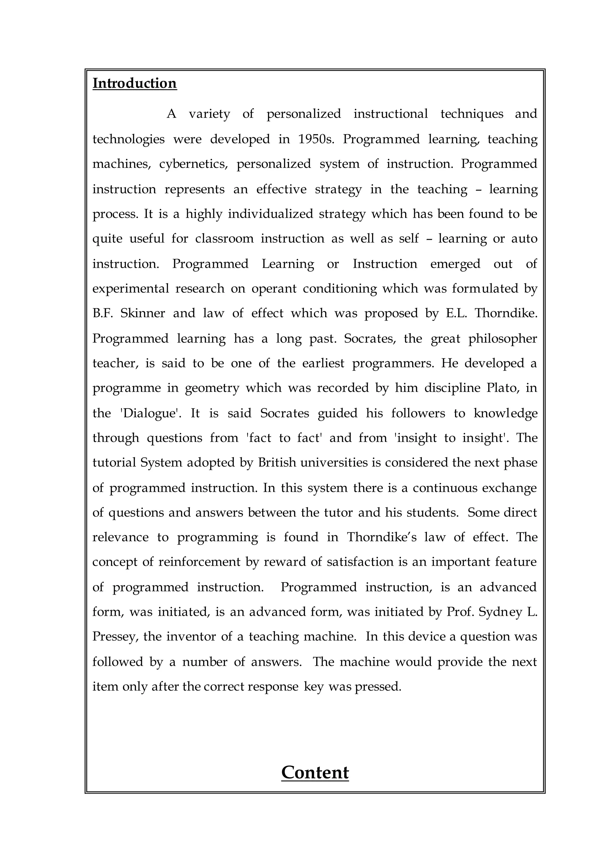 1. Programmed instruction is an individualized teaching strategy developed in the 1950s based on behavioral psychology principles. It breaks content into small sequential steps with frequent questions and immediate feedback.