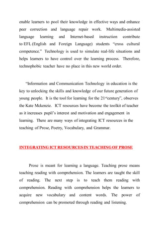 This document discusses ways that information and communication technologies (ICT) can be integrated into teaching English language skills like prose, poetry, vocabulary, and grammar. It provides examples of how tools like PowerPoint, videos, audio recordings, online dictionaries, websites and games can be used to engage students and make lessons more interactive. For teaching prose, films and podcasts can connect words to pictures. For poetry, recordings and images can help recreate the musicality. Vocabulary and grammar can be taught through multimedia contexts and games to make learning more fun. Overall, ICT can motivate students and support collaborative learning when integrated effectively into language instruction.