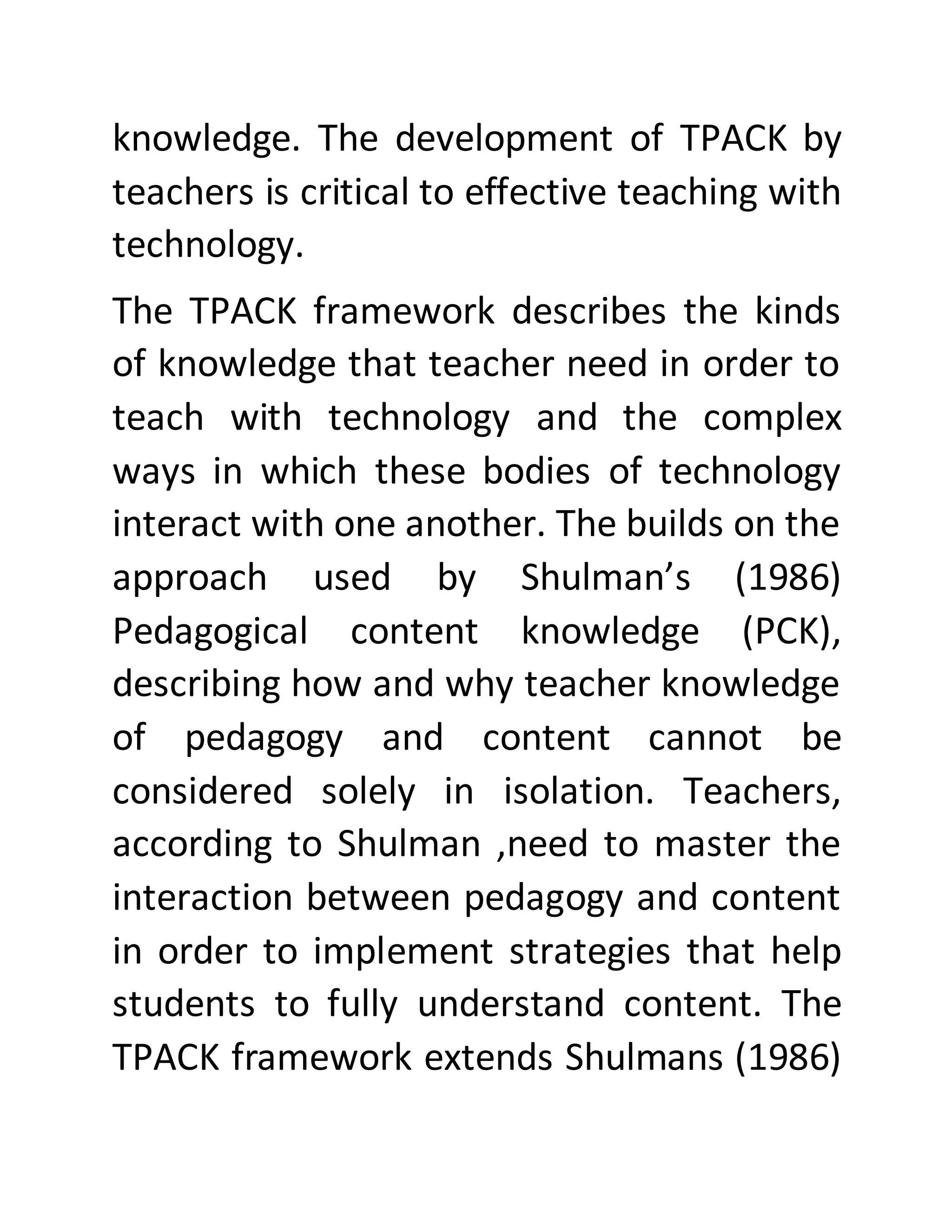 The document discusses the TPACK (Technological Pedagogical Content Knowledge) framework, which describes the types of knowledge teachers need to effectively teach with technology. It introduces TPACK as an extension of Shulman's PCK (Pedagogical Content Knowledge) framework to include technology knowledge. The document then provides an overview of the TPACK framework and its components - technological knowledge, content knowledge, pedagogical knowledge, technological content knowledge, technological pedagogical knowledge, and pedagogical content knowledge. It discusses the interactions between these knowledge domains and challenges to implementing TPACK in teaching.