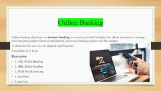 Online banking,also known as internet banking, is a service provided by banks that allows customers to manage