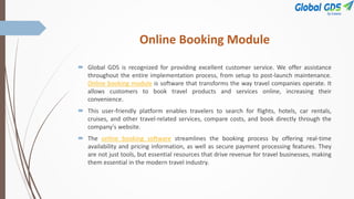 The online booking module by Global GDS enhances the travel industry's efficiency by enabling real-time booking and payment processing for flights, hotels, and other services. It offers a user-friendly platform that caters to travelers' needs while providing travel businesses with tools to manage bookings more effectively and personalize marketing. The system is designed for 24/7 accessibility, increasing convenience for customers and driving revenue for travel companies.