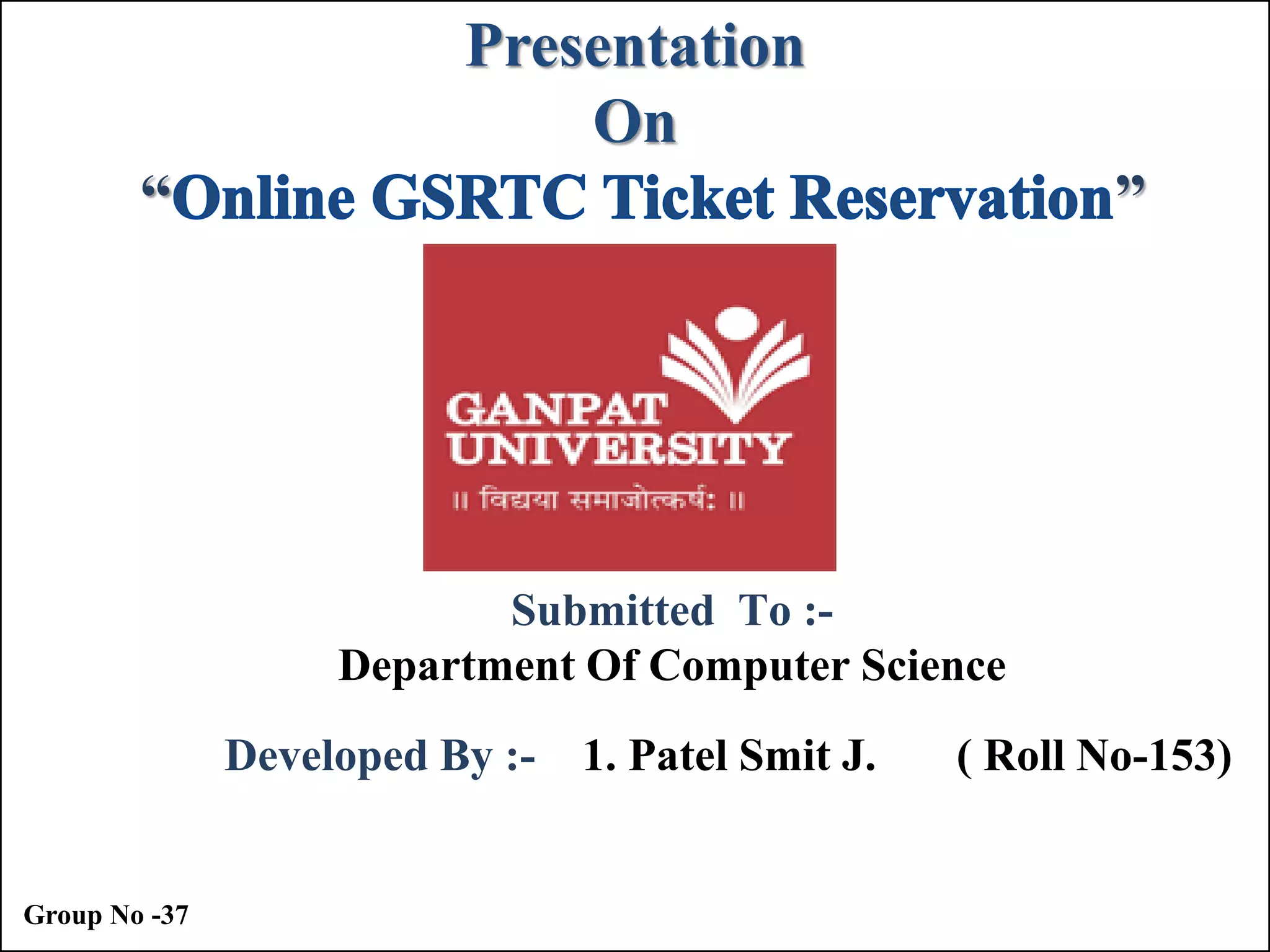 This document provides details about a project presentation on "Online GSRTC Ticket Reservation" submitted to the Department of Computer Science. It includes personal details of the group members, the project definition and objectives, existing system limitations, need for a new system, hardware and software requirements, system flow chart, ER diagram, use case diagrams, activity diagrams, class diagram, sequence diagrams, collaboration diagram, and data dictionary. The presentation outlines the development of a new online ticket reservation system for GSRTC to address issues with the existing system and provide additional features and convenience to users.