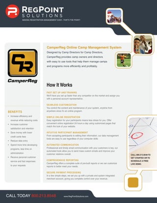 RegPoint Solutions offers CamperReg, an online camp management system designed to help camp directors and owners manage their camps and programs more efficiently. CamperReg provides tools for online registration, participant management, automated communication, and comprehensive reporting. It also offers fast setup and training, seamless customization, and secure payment processing to help camps increase revenue and efficiency while reducing costs.