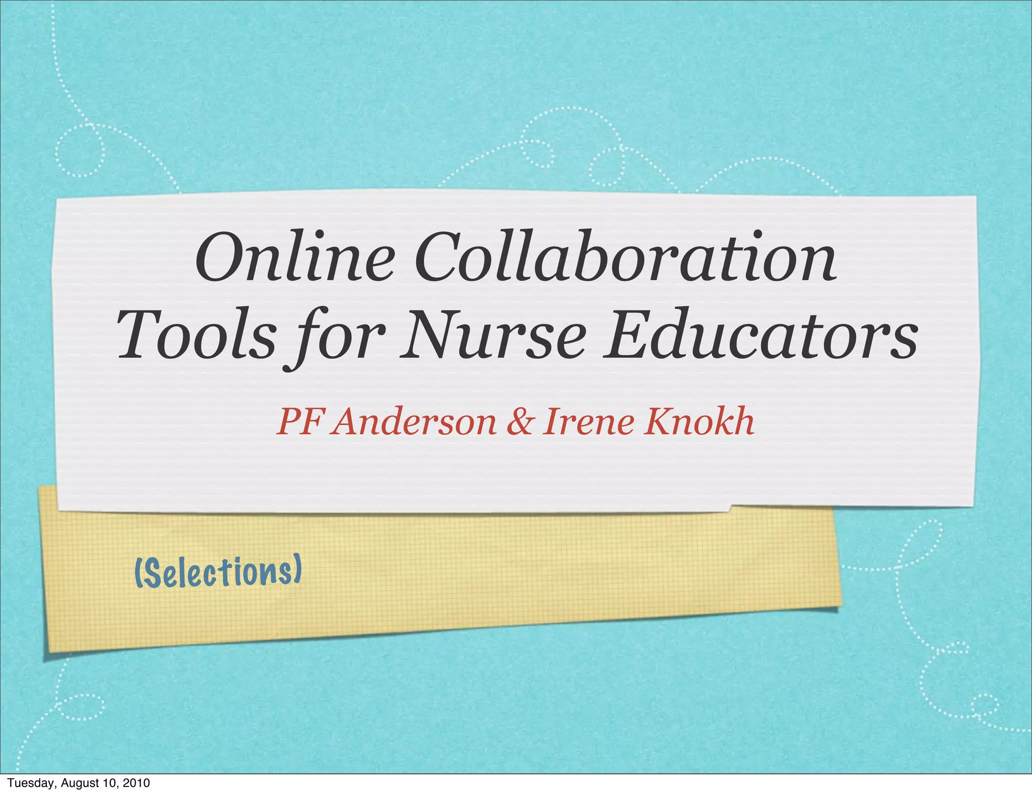 The document discusses online collaboration tools that can be used by nurse educators, including tools for brainstorming, cases, communication, data visualization, file sharing, group work/wikis, presentations, and storytelling. It was authored by PF Anderson and Irene Knokh from the University of Michigan, and provides their contact information.