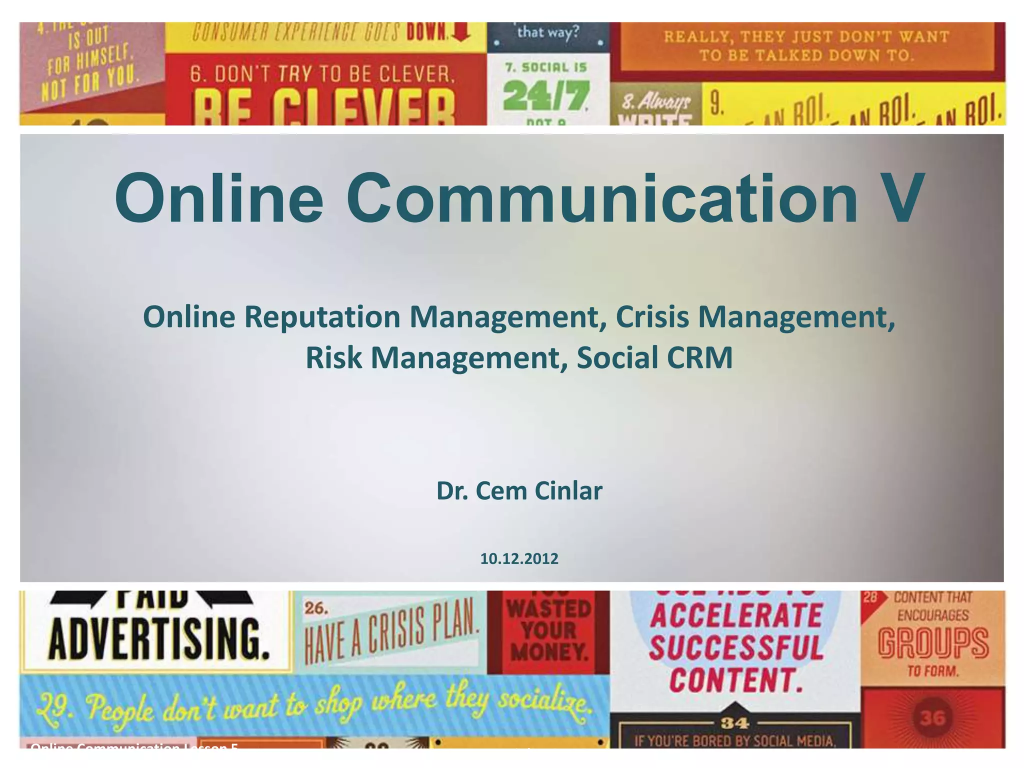 The document discusses the importance of online communication in crisis management, risk management, and social CRM. It outlines a nine-step risk management life cycle, including monitoring, risk assessment, reporting, and modification processes. Additionally, it emphasizes integrating social media strategies to enhance understanding and engagement with customers while managing risks effectively.