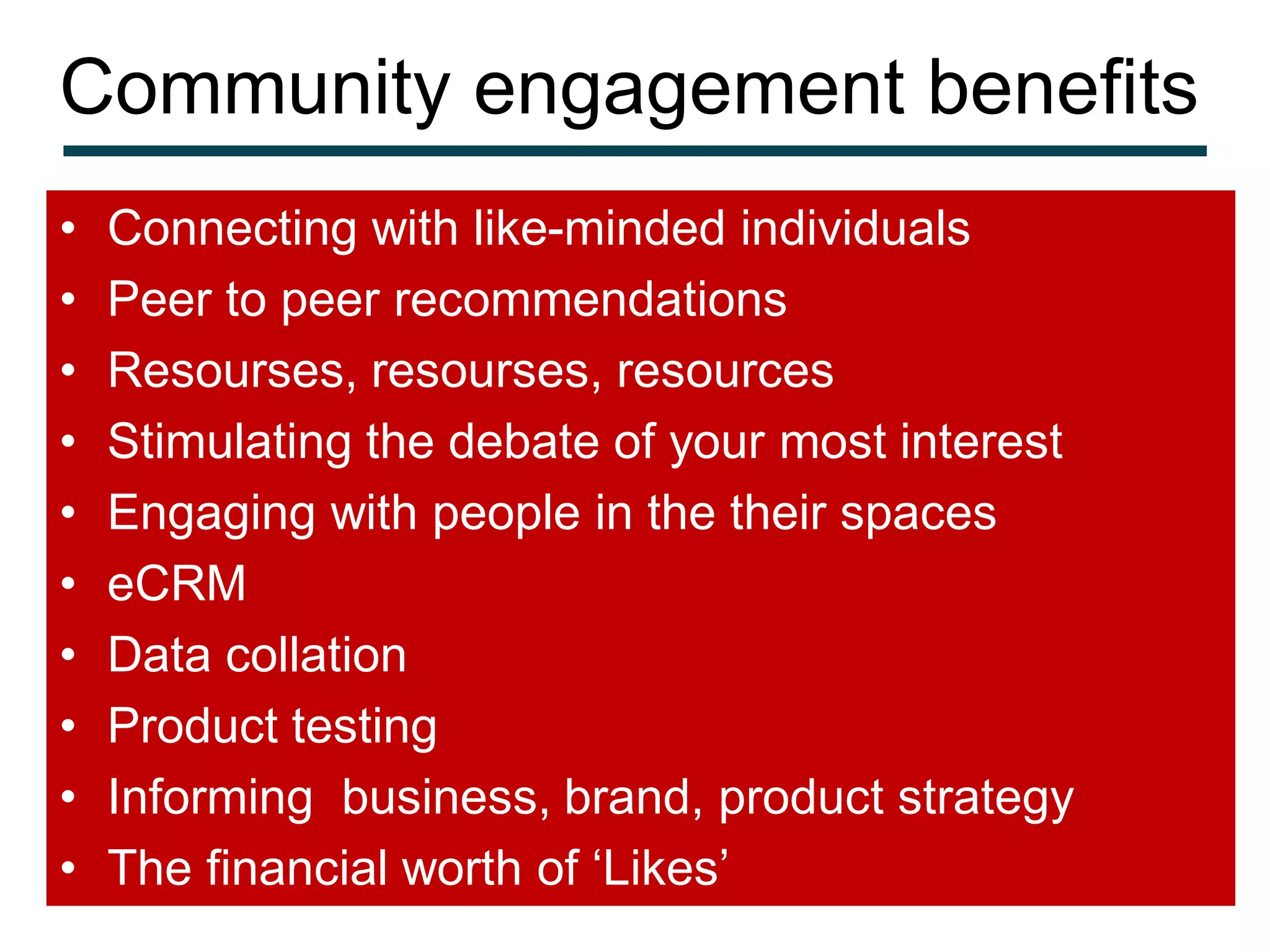 This document discusses the benefits and risks of online communities and engagement strategies. It outlines how communities can be used to connect with like-minded individuals, share resources, stimulate debate, and inform business strategy. However, it also notes risks such as lack of buy-in, absence of strategy and measures. The document provides tips on identifying relevant communities, participation guidelines, developing partnership and exit strategies, and measures of success. It emphasizes the importance of listening, having a response strategy, clear roles, and buy-in across the organization for effective online community engagement.