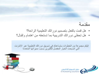 تتحدث الوثيقة عن أهمية وطرق تسويق الدورات التدريبية عبر الإنترنت، مشيرةً إلى ضرورة تصميم دورات تعليمية مميزة وتحقيق الاهتمام اللازم. كما تقدم استراتيجيات تسويقية مثل استخدام 4ps (السعر، المنتج، العروض، المكان) وتحديد الشريحة المستهدفة للتسويق. تُعتبر الدورات التعليمية عبر الإنترنت خيارًا مفضلًا بسبب مرونتها وجاذبيتها للمتدربين.