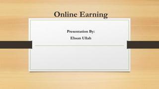 This document discusses several popular ways to earn money online, including affiliate programs, customer service jobs, freelancing, tutoring, transcription, Google AdSense, and creating PowerPoint templates. It then explains the process of setting up accounts with Payoneer and PayPal to receive online earnings despite Pakistan not directly supporting PayPal. This involves generating fake US identification, linking a US bank account through Payoneer, and using that information to verify a PayPal account to enable receiving online payments. Money can then be transferred from PayPal to Payoneer and withdrawn from Pakistani banks supporting Payoneer.