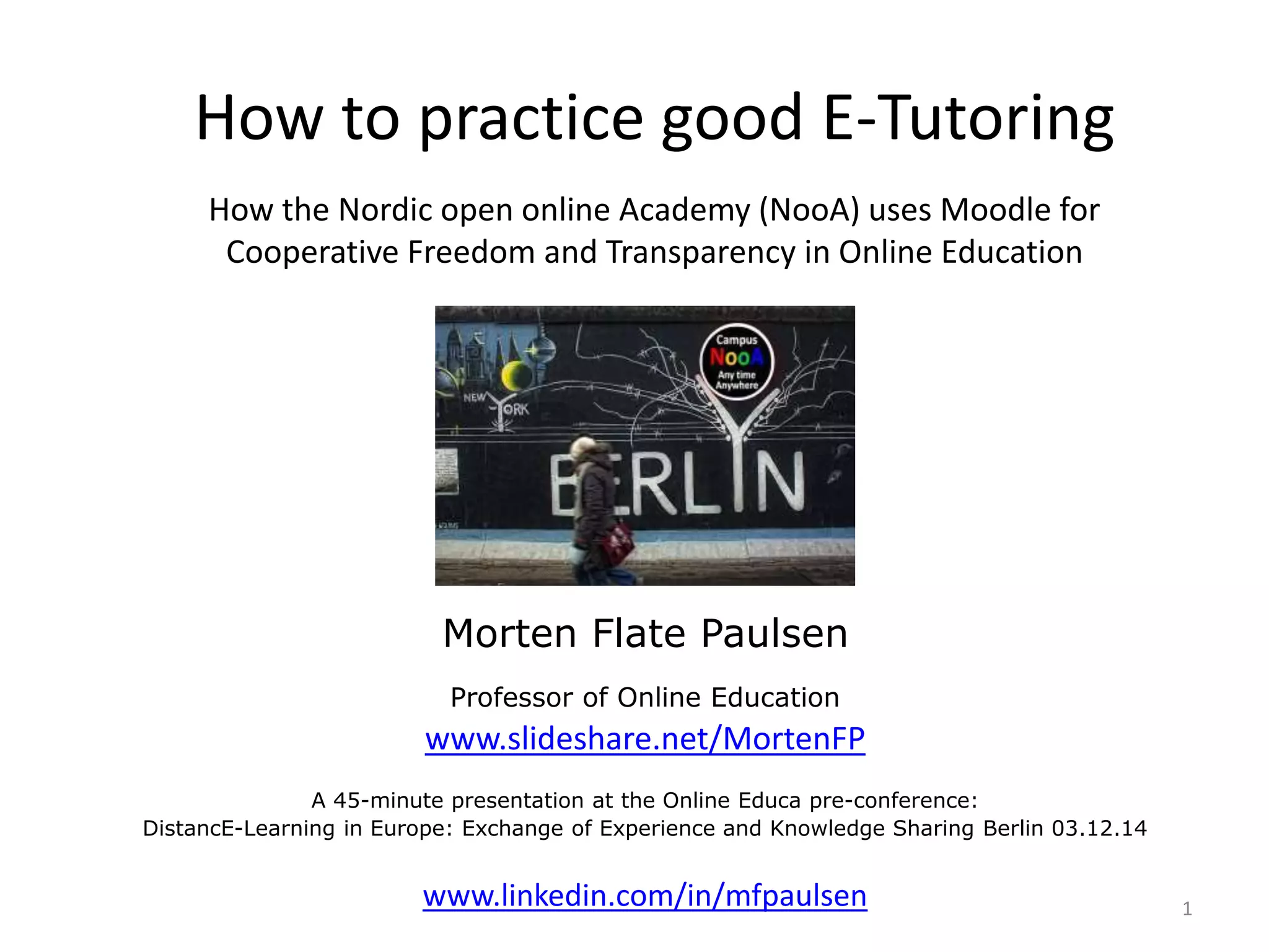 The Nordic Open Online Academy (NOOA) aims to become an international center for online courses, offering 60 courses in multiple languages through the Moodle platform. It focuses on the theory of cooperative freedom and transparency in online education, promoting individual flexibility and meaningful cooperation among learners. The presentation outlines how NOOA implements various freedoms regarding time, space, pace, medium, access, content, and cooperation in its online educational framework.