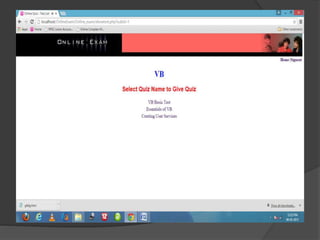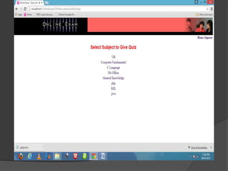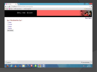This document describes an online exam system project built with PHP and MySQL. It discusses the modules of the system, including Admin and Student. It provides context and system requirement diagrams. The objectives are to allow fast processing of exams, a reliable exam platform, and ability to check exam status. Screenshots show the sign up, login, home, admin, question, and result pages.
