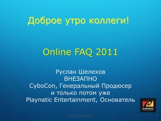 Доклад Руслана Шелехова на конференции Cybocon 2011 освещает состояние и тренды рынка онлайн-развлечений, включая цифры по росту доходов и числу пользователей. Он анализирует рынок онлайн-игр в СНГ, подчеркивая, что в 2010 году объем рынка составил около 9,1 млрд долларов, с отдельным вниманием к социальным и мобильным играм. Особое внимание уделяется появлению новых направлений, таких как игры для мобильных платформ и развитие смартфонов.