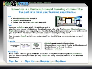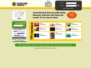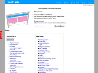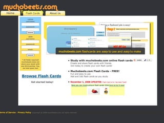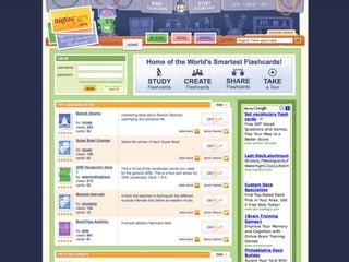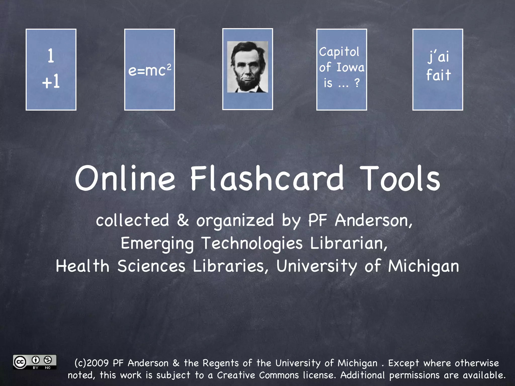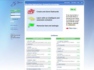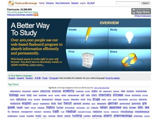This document provides a list of online flashcard tools for creating, sharing, and studying flashcards. It includes links to websites for finding existing flashcards, generating new flashcards, using social networking features for flashcards, and accessing a collection of flashcard links through a toolbar or browse and random options. The document also cites its copyright and licensing.
