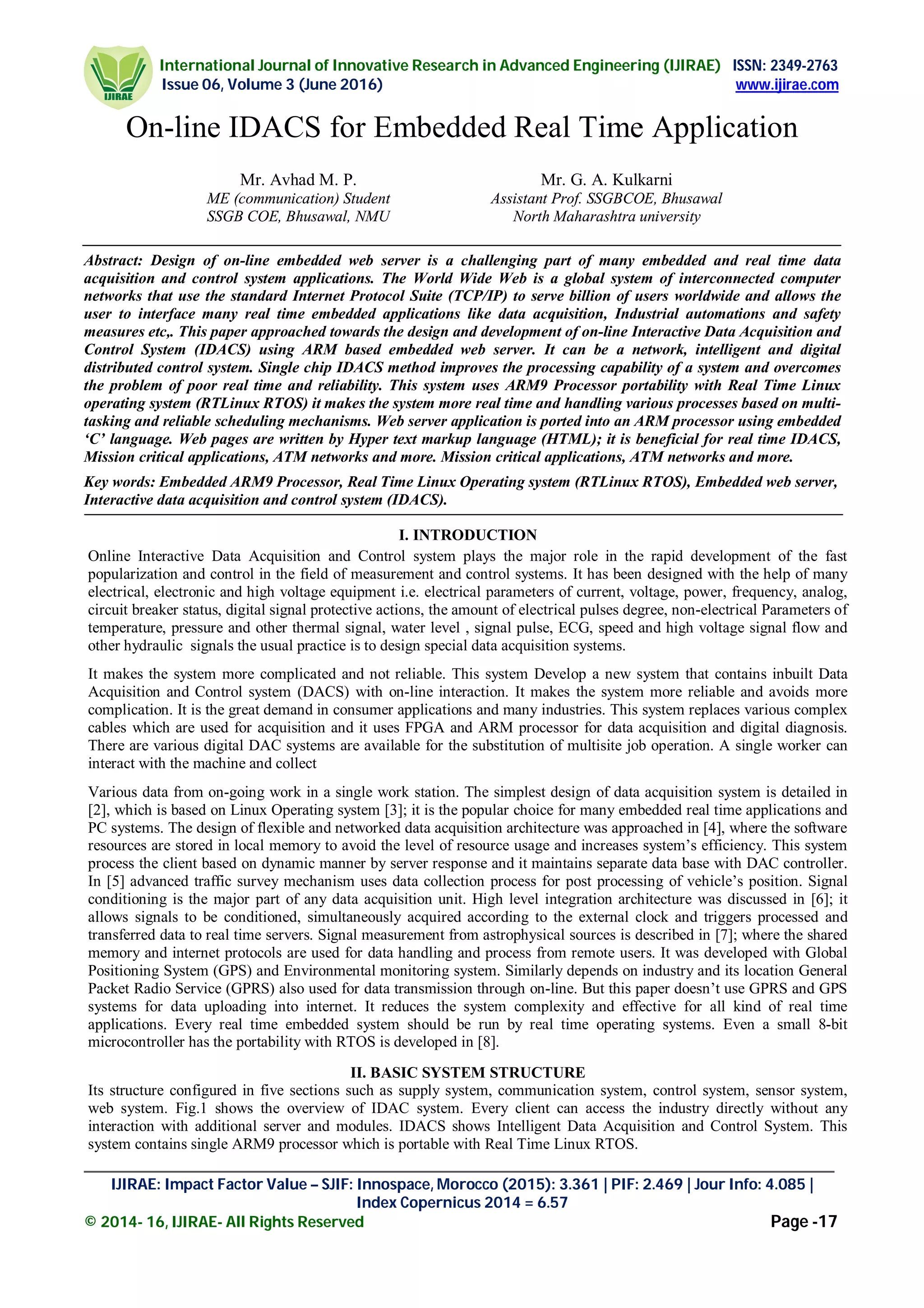 This document presents the design and development of an online Interactive Data Acquisition and Control System (IDACS) using an ARM-based embedded web server. The system uses an ARM9 processor running a Real-Time Linux operating system to handle data acquisition and control functions as well as hosting an embedded web server. Sensors are interfaced to the ARM9 to measure parameters like temperature, humidity, gas levels etc. The embedded web server allows clients to access the sensor data and send control instructions through a web browser interface. The system aims to provide a low-cost, low-power solution for real-time data acquisition and control in industrial applications.