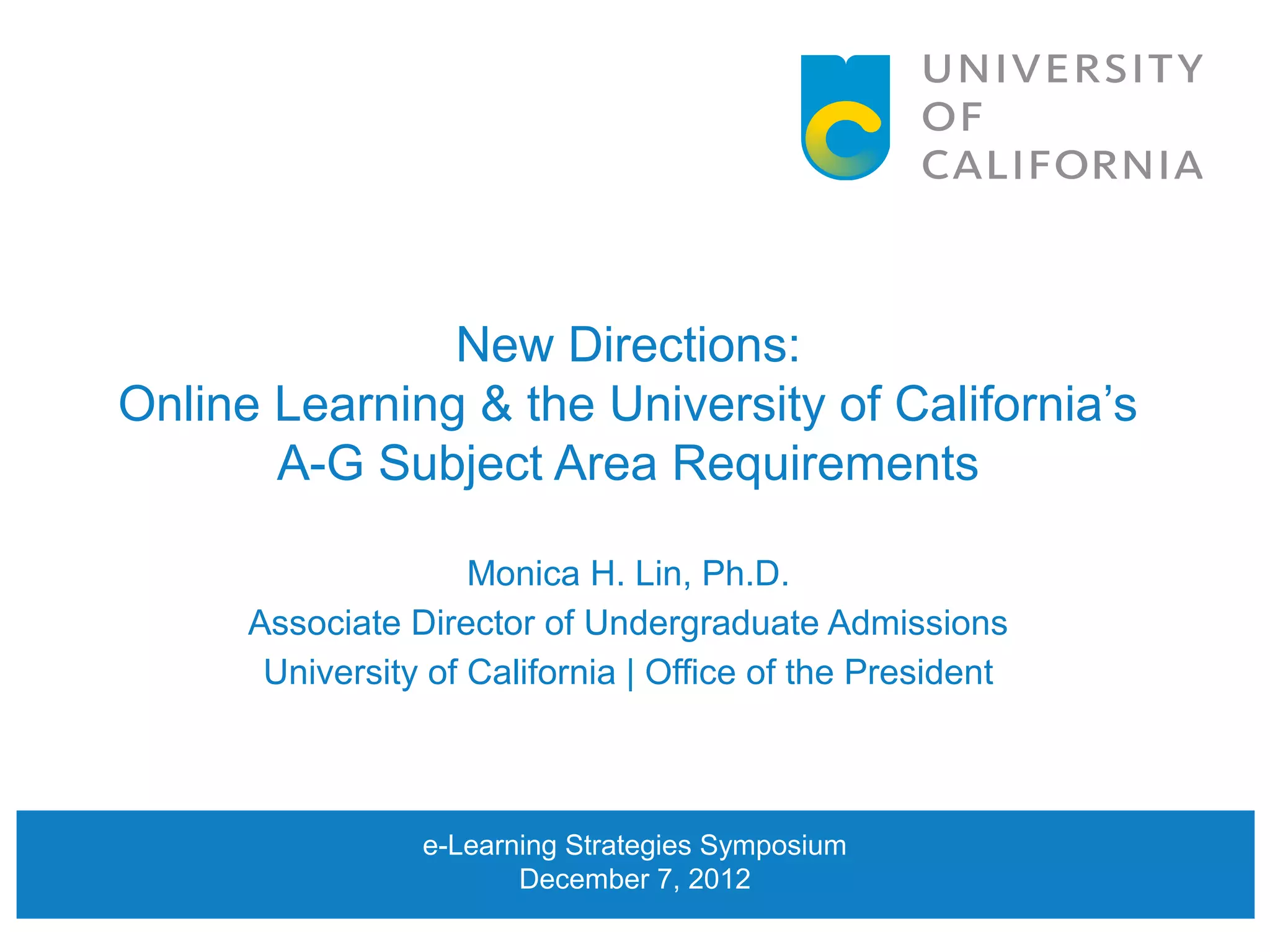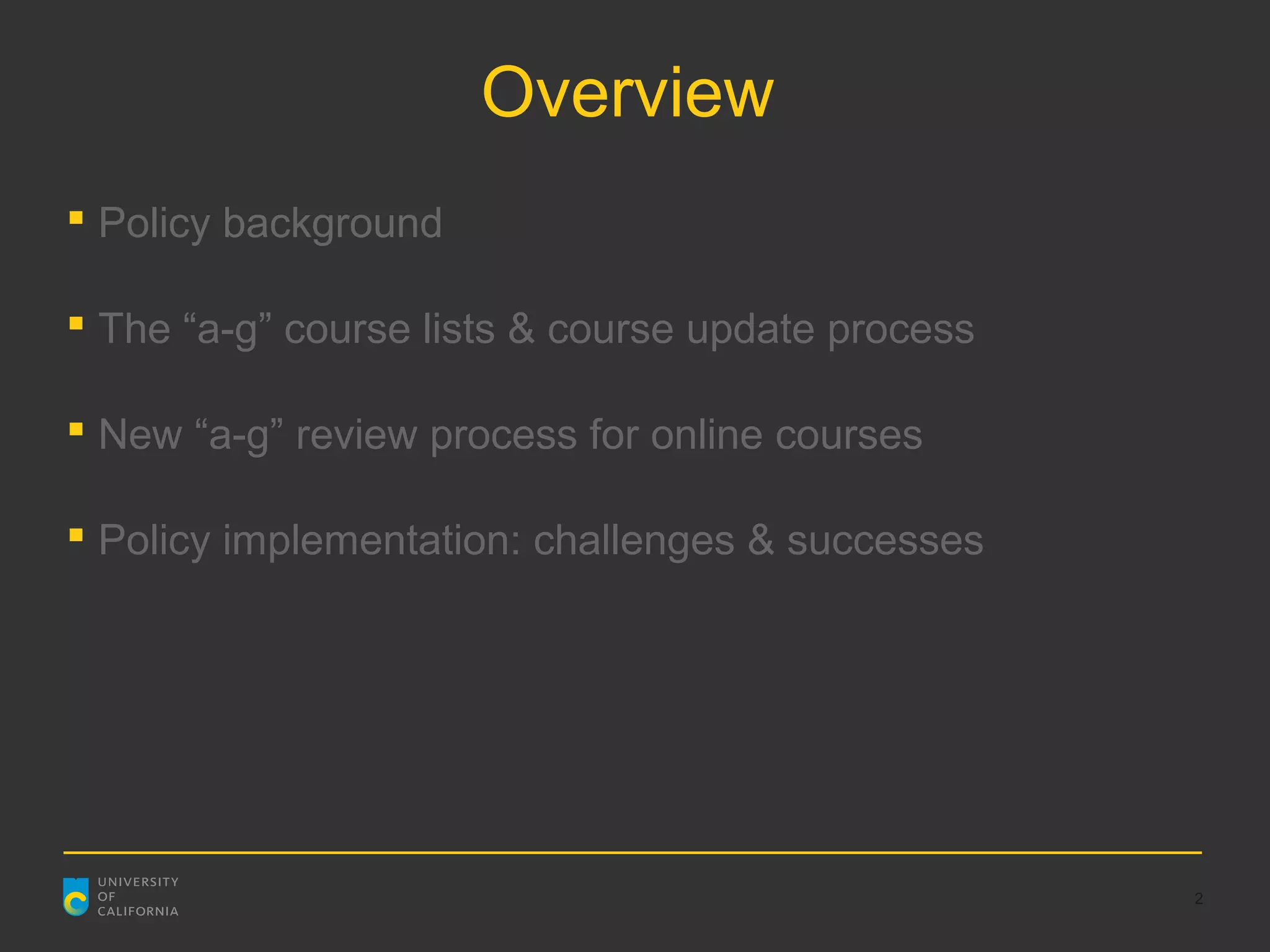 The document outlines the University of California's new policies regarding online courses and their alignment with the 'a-g' subject area requirements for admissions. Key changes include the elimination of the 'program status' requirement for online entities, a focus on quality assessment of online courses, and a new review process that adheres to national standards. Challenges and successes in implementing these policies are discussed, including improved efficiencies and increased access to quality 'a-g' online courses.