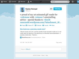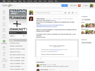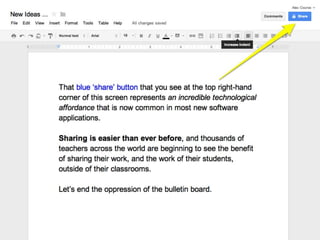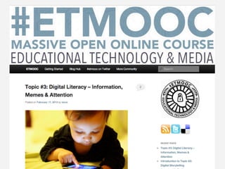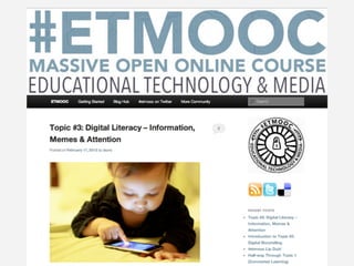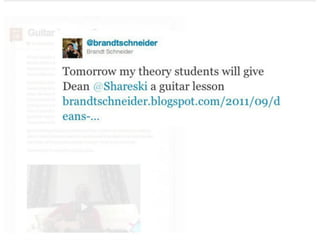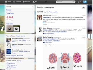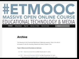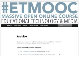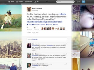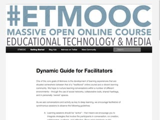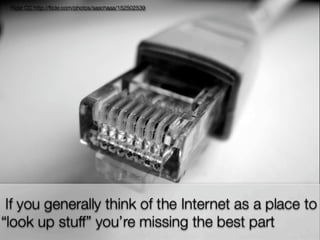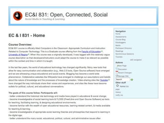 Online learning is being transformed by new technologies and social connections. [1] Tools like YouTube and social media allow learning to occur anywhere and be shared widely. [2] Networks provide opportunities for inspiration, collaboration, and crowdsourcing knowledge. [3] Visible, open learning helps develop strong connections and communities for sharing ideas.