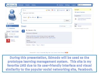 This document summarizes online learning in K-12 schools. It discusses how learning management systems can provide collaborative learning opportunities through file sharing, online communication tools, and linking to online content. These systems also allow for online polls, assignments, quizzes and the creation of student portfolios. While some teachers may be apprehensive about the change, online learning prepares students for a digital world and promotes self-directed learning through unlimited access to class resources.