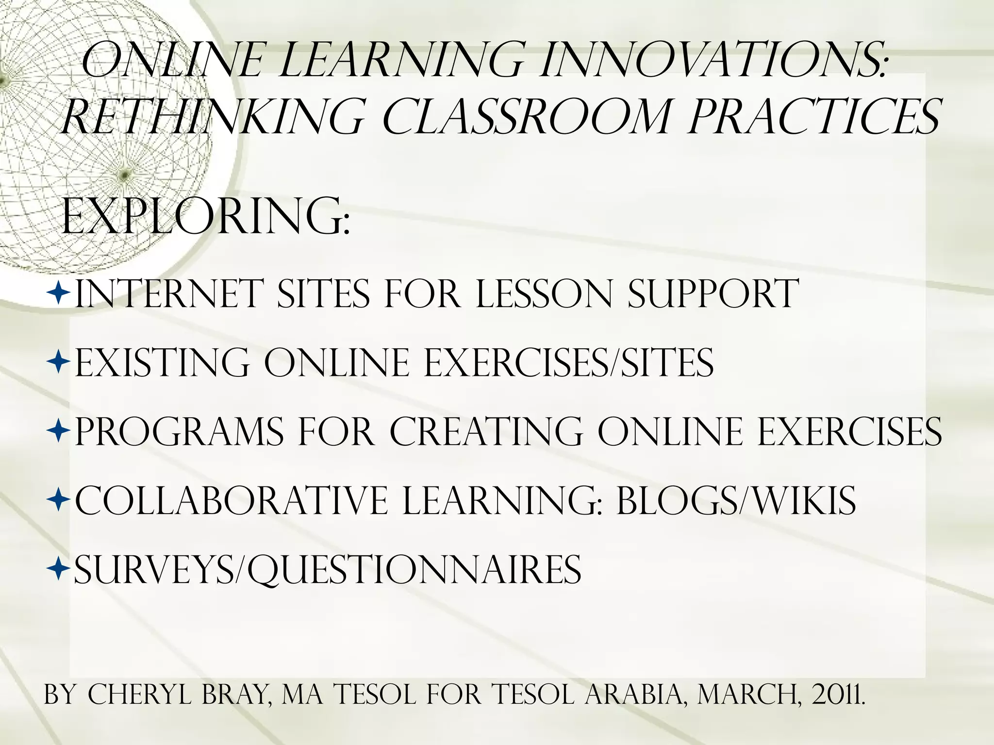 The document discusses online learning innovations aimed at rethinking classroom practices, highlighting the importance of collaborative learning, multimedia resources, and diverse teaching methods that cater to various learning styles. It emphasizes the role of technology in empowering students and enhancing their learning experience through tools like blogs, wikis, and online surveys. Additionally, it showcases specific programs and websites that facilitate the creation of online exercises and support lesson planning.