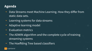 The document discusses online machine learning in streaming applications, emphasizing the differences between data streams and static datasets, as well as the challenges of stream-based learning, such as concept drift and evolving feature spaces. It covers learning systems' desirable properties, evaluation metrics, and specific algorithms like the Adwin algorithm and Hoeffding tree classifiers for handling real-time data. The presentation highlights the adaptive learning model necessary for processing continuous data while managing memory constraints and adapting to changes in data distribution.
