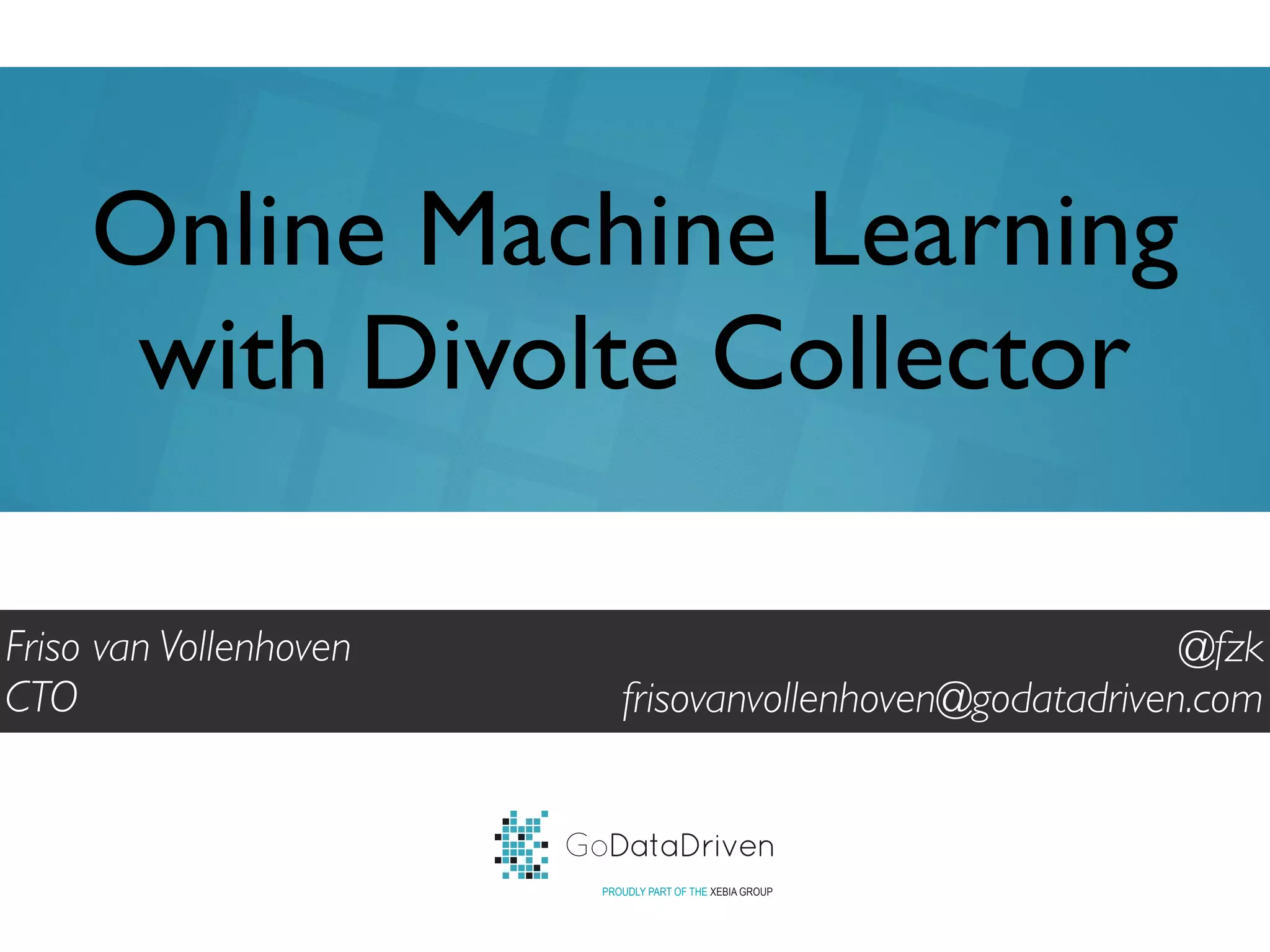 This document discusses using online machine learning techniques to optimize online content recommendations. It proposes using a Bayesian bandit approach to select images for display on a homepage by tracking click-through rates and impressions for each image. As the bandit algorithm learns preferences over time, it will select images with higher click-through rates more often. The system would collect data using a Javascript tag and stream events to Kafka for real-time optimization of recommendations.