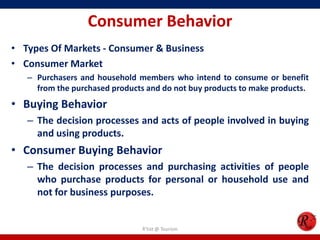 This document discusses consumer behavior in online marketing. It begins by defining consumer and business markets, and consumer buying behavior. It then covers the consumer decision-making process, which involves problem recognition, information search, evaluation of alternatives, purchase, and post-purchase evaluation. Influences on consumer behavior include personal characteristics, psychological factors, and environmental influences. The document also discusses types of online shoppers and compares online versus traditional consumers in terms of technology adoption, convenience, loyalty and trust, products versus services, and site design.