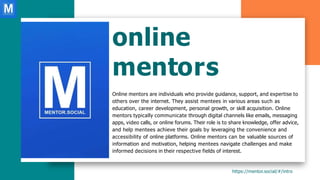 Online mentors provide guidance and support over the internet, assisting mentees in areas such as education, career development, and personal growth. They communicate through digital channels and leverage technology to connect with individuals regardless of geographical barriers. Online mentors' expertise spans various fields, making them valuable resources for skill development and informed decision-making.