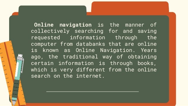 1. The document discusses online navigation and how it differs from traditional research methods using books. It defines online navigation as searching for and saving information from online databases.