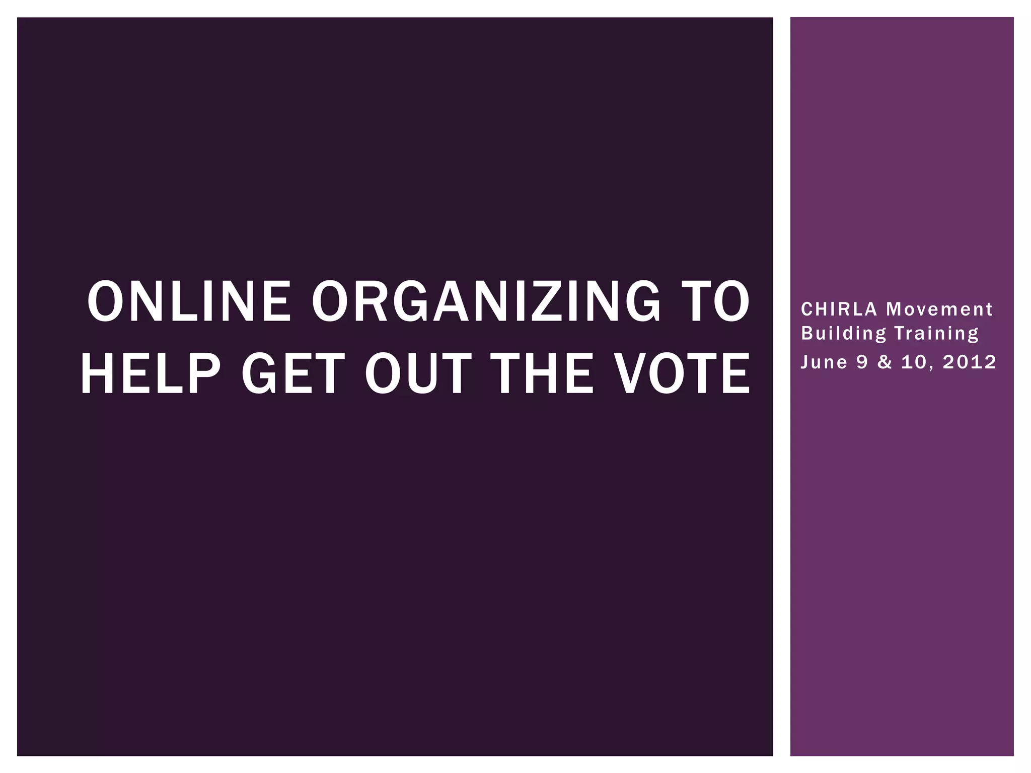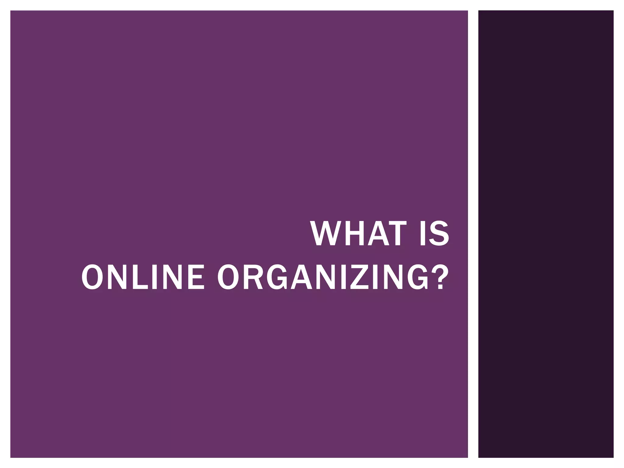 Online organizing allows individuals to participate in campaigns through digital communications and mobilization, complementing traditional in-person organizing. It has benefits like engaging supporters creatively, connecting local stories to national issues, and mobilizing people quickly. Online tools include social media, email, texting, and collecting data. Organizers should integrate online strategies throughout their campaigns, from voter registration drives to get-out-the-vote efforts. Text messaging is particularly effective for mobilizing communities cost-effectively at scale. All staff can contribute by gathering contact data and coordinating online and offline organizing activities.