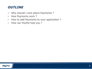 This document provides an overview of payments for developers, including why payments are important, how different payment methods work, and how to integrate payments into applications. It discusses various monetization strategies and payment networks like credit cards, debit cards, and ACH transfers. The document also describes payment gateways versus payment providers, and how PayPal can help with its global payments platform and APIs that enable many monetization models and payment types, including its Express Checkout and Adaptive Payments solutions.