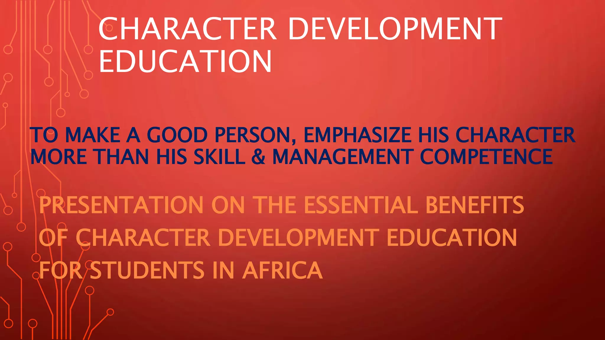 This presentation highlights the importance of character development education in Africa, arguing that it plays a crucial role in shaping students' moral values and personal judgments, which are essential for true leadership. It emphasizes the need to integrate character education into school curricula to balance intellectual development with moral awareness, ultimately fostering responsible and innovative future leaders. The speaker, Iwobe Kingsley, advocates for a shift in educational focus from purely academic skills to include character education as a means to combat societal corruption and inspire effective decision-making among students.