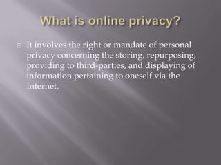 This document discusses computer privacy and security. It defines privacy as the right to control personal information online. It then discusses phishing scams, which try to steal user credentials by posing as trustworthy entities. The document provides examples of phishing scams and outlines best practices for social media privacy and security, including using private browsing which doesn't save browsing history or passwords.