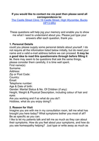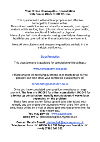 This document provides information about an online homeopathic consultation service with Denise Clark. It details that the consultation is best suited for non-urgent chronic health issues, whether physical, emotional, or intellectual. Patients complete a detailed questionnaire about their medical history and symptoms which is then reviewed by Denise Clark to determine an appropriate homeopathic treatment. Payment details and contact information are also provided.