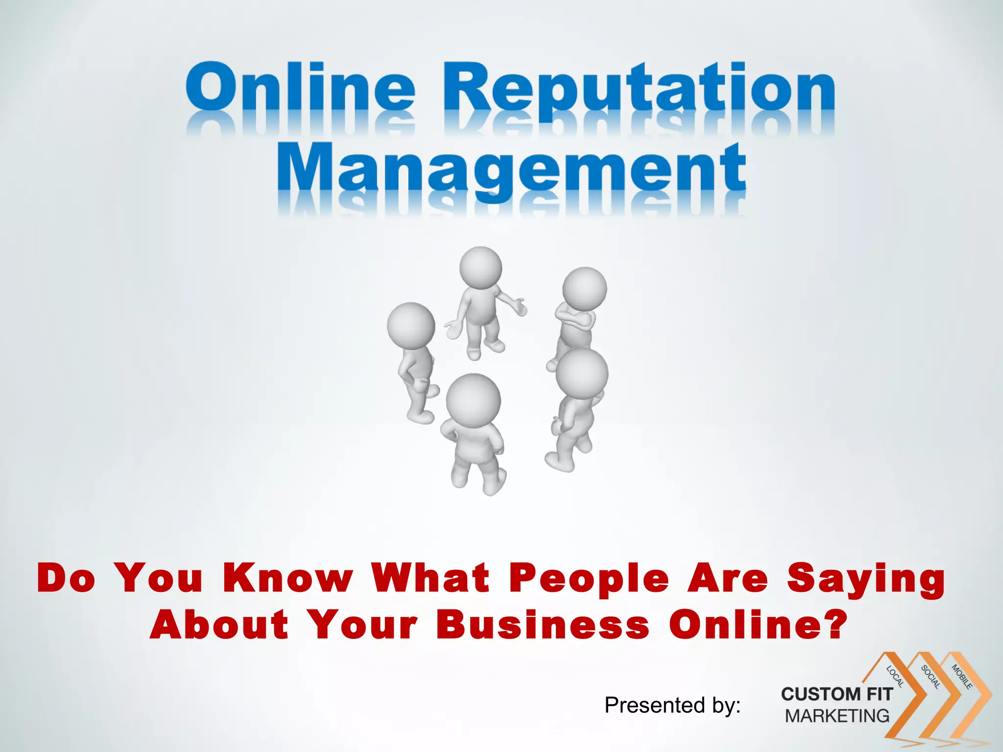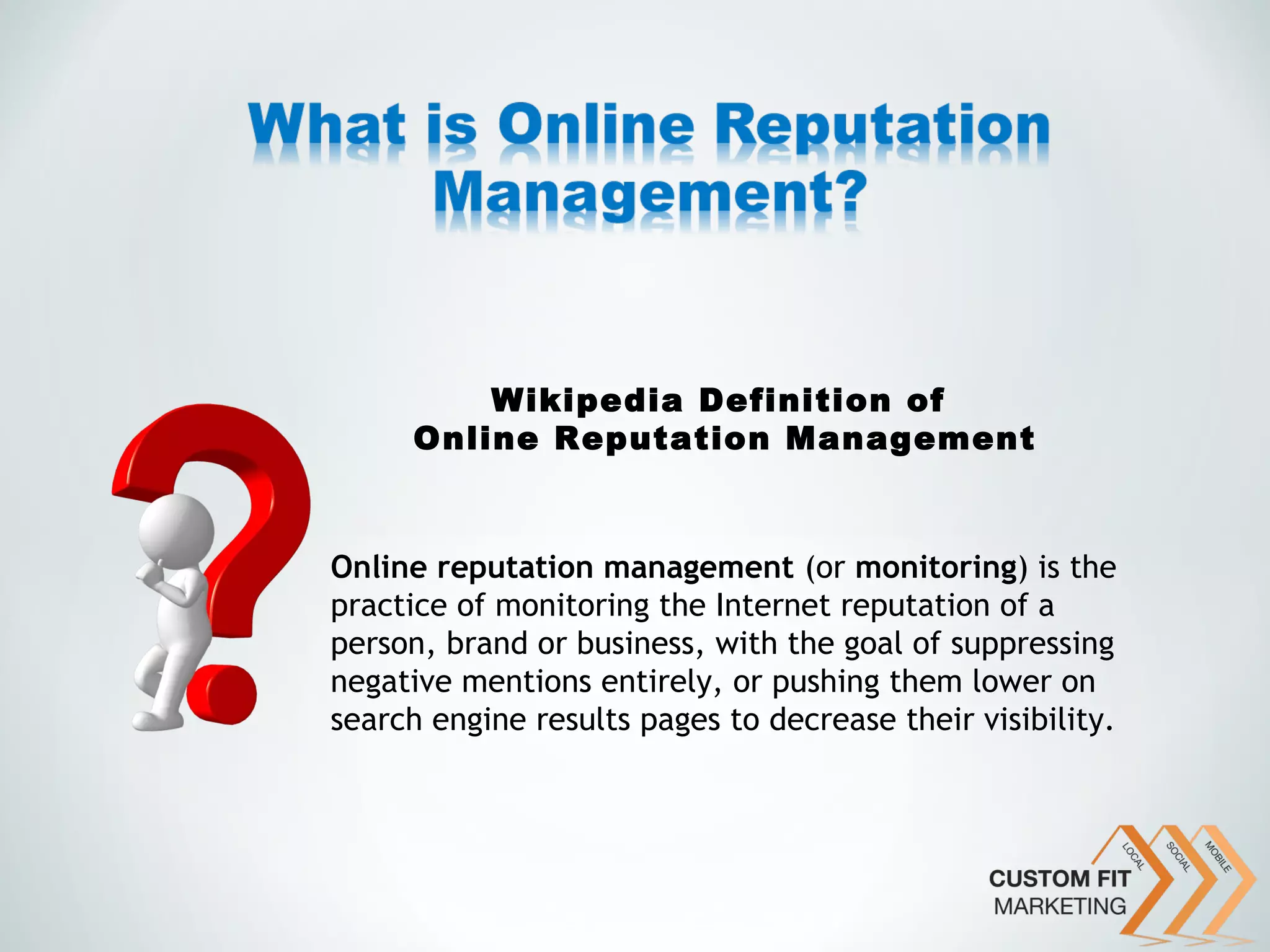 The document discusses online reputation management (ORM), emphasizing its importance in monitoring and addressing a business's online presence to suppress negative feedback. It outlines strategies for businesses to enhance their reputation, such as proactively seeking positive reviews, engaging with customers online, and creating quality content. By effectively managing online perceptions, businesses can retain existing customers, attract new ones, and ultimately improve their financial performance.