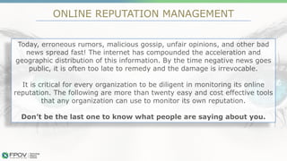 The document outlines the importance of online reputation management and provides a comprehensive list of over twenty tools that organizations can utilize to monitor their reputation in real-time. These tools vary in their functionality, from social media analytics to sentiment analysis, enabling organizations to react proactively to negative news and maintain a positive online presence. The document also features a brief introduction to the Technology Mastery Institute, which focuses on educating leaders about technology and reputation management.