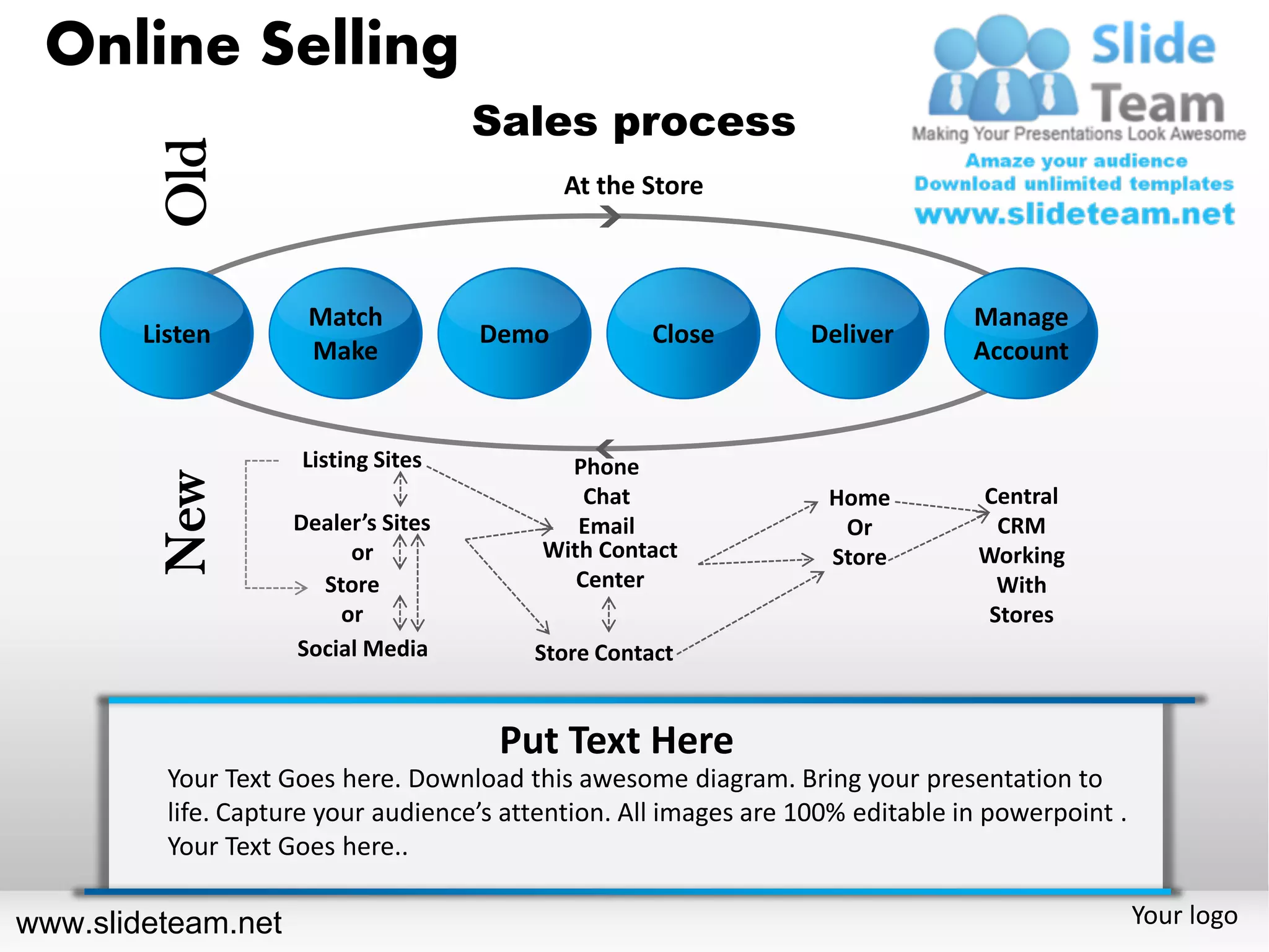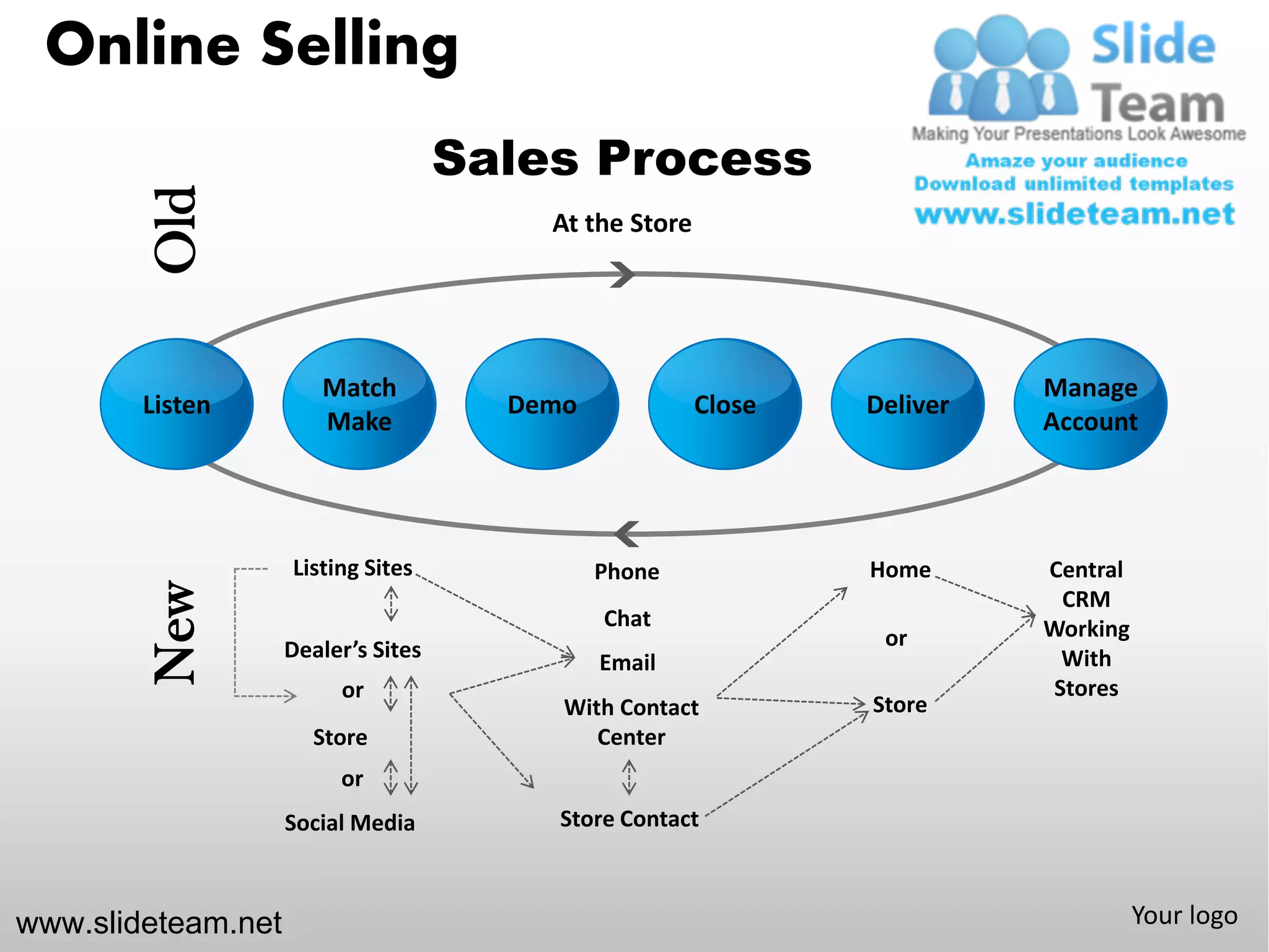 The document compares the traditional in-store sales process to the online sales process. The traditional process involves matching customers to products, listening to customers' needs, demonstrating products, closing the sale, delivering the product, and managing customer accounts all within the store. The online process involves using listing sites, phone, dealer sites, stores, or social media to connect with customers and move them through the sales funnel. It also utilizes tools like chat, email, phone, and CRM systems to communicate with and provide support to customers.