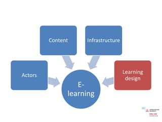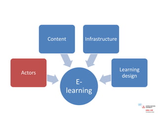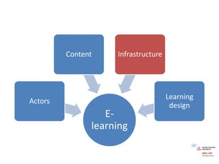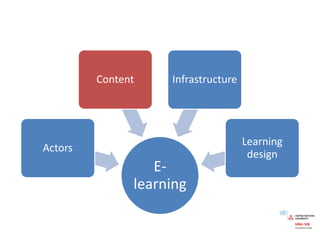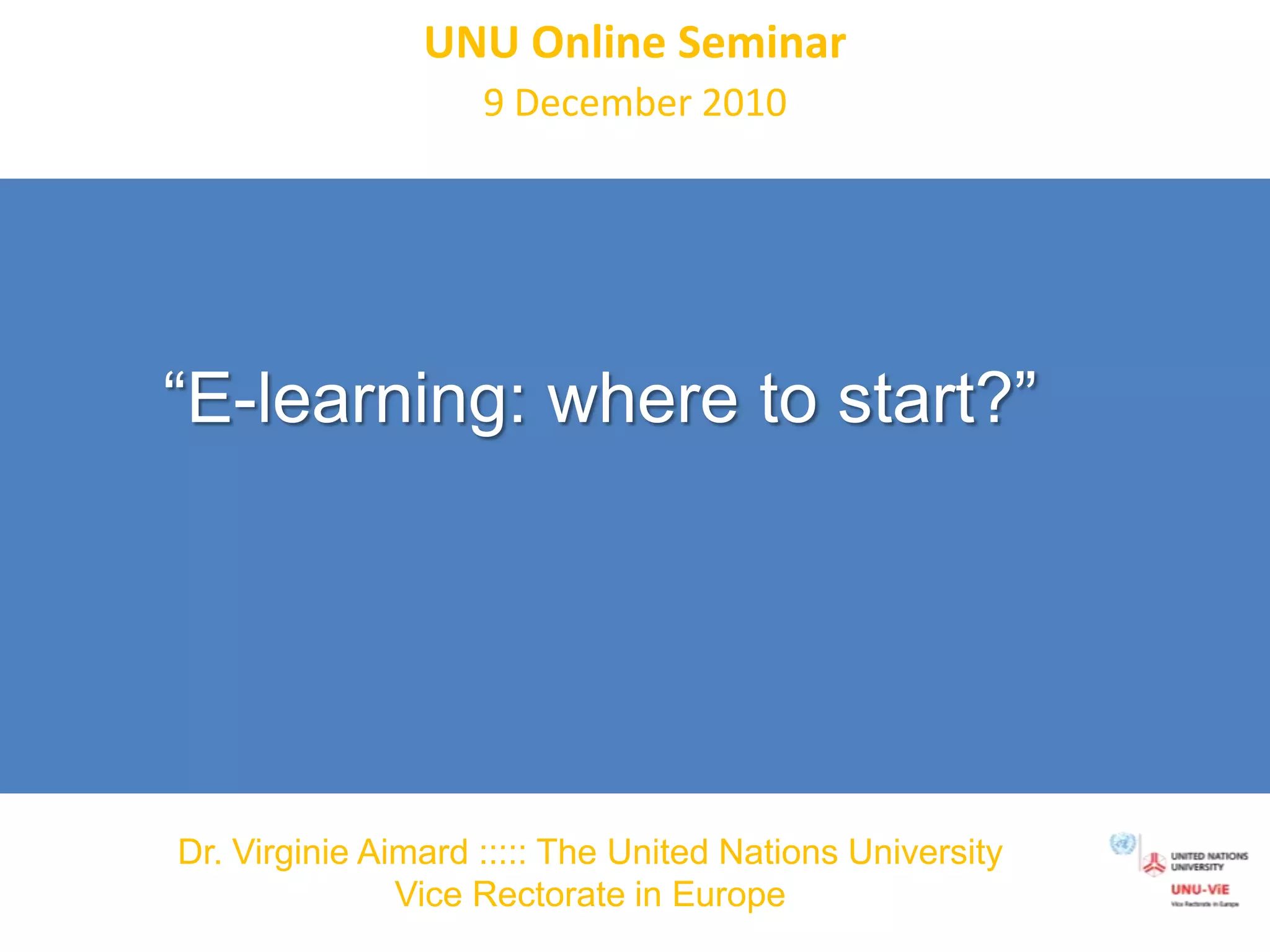 This document summarizes an online seminar on e-learning given by Dr. Virginie Aimard of the United Nations University. The seminar covered definitions of e-learning, trends in e-learning such as the shift from computer-based to web-based learning, dimensions of e-learning including pedagogical modalities and competency profiles, and questions to consider when developing an e-learning approach. Examples of open educational resources and blended learning structures were also provided.