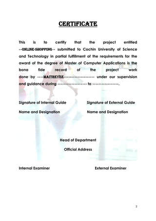 This document provides a project report for the completion of a 4th semester mini project on online shopping. It includes an introduction to the project, existing system analysis and drawbacks, proposed system details, feasibility study, requirements analysis, system design specification, and planned testing. The project aims to develop an online shopping system that allows customers to shop from home, provides lower prices due to reduced overhead costs, and offers free home delivery. It will use JSP for the front end and MySQL for the back end.