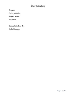 The document outlines the user interface for an online shopping project named 'Buy Smart', detailing various features for mobile and computer views such as home screen navigation, item listing, cart functionality, user account creation, login options, and payment methods including cash on delivery and card payments. It also includes an admin view for product management and information visibility when orders are placed. Additionally, there are sections on user queries and feedback mechanisms.