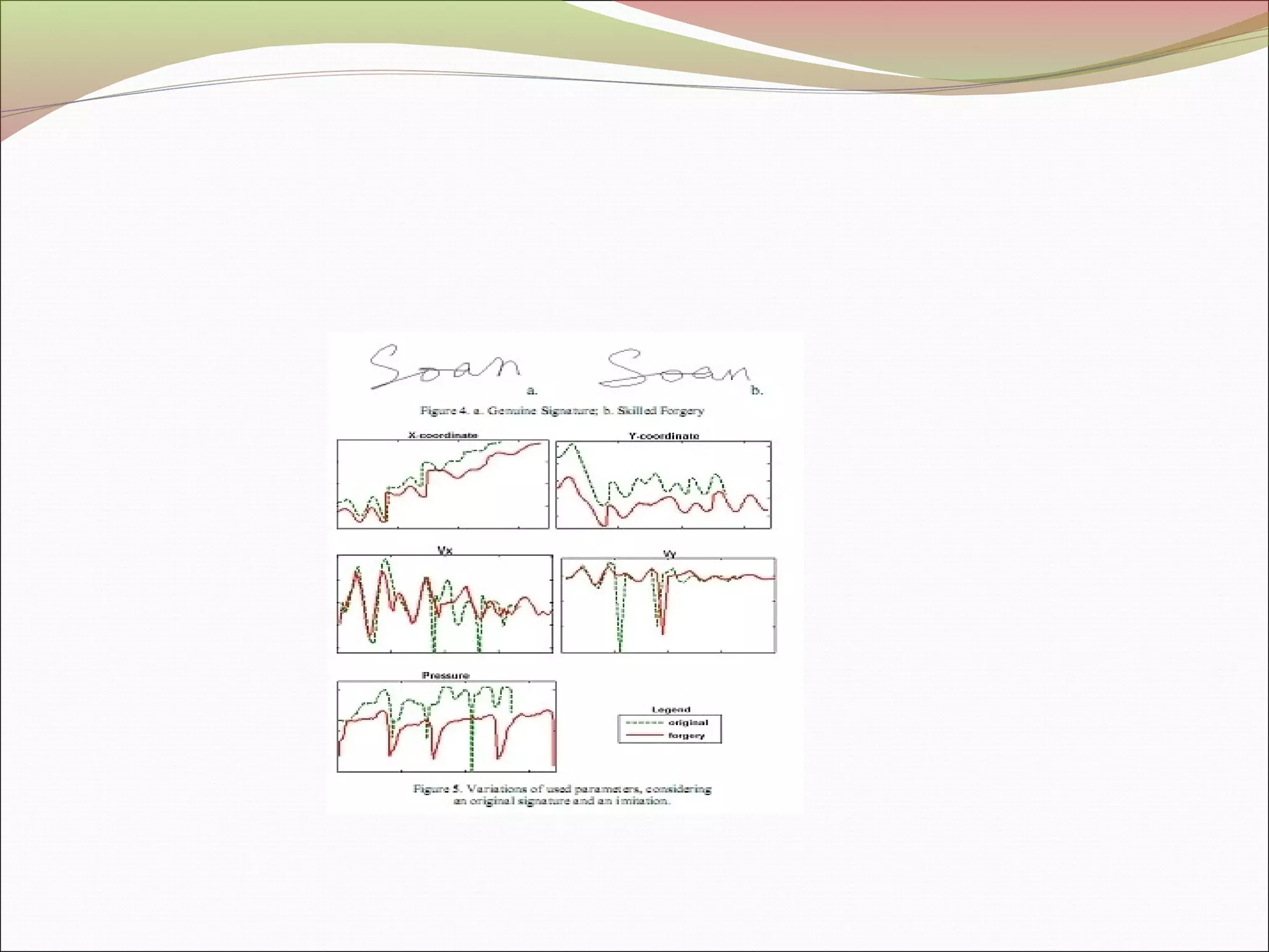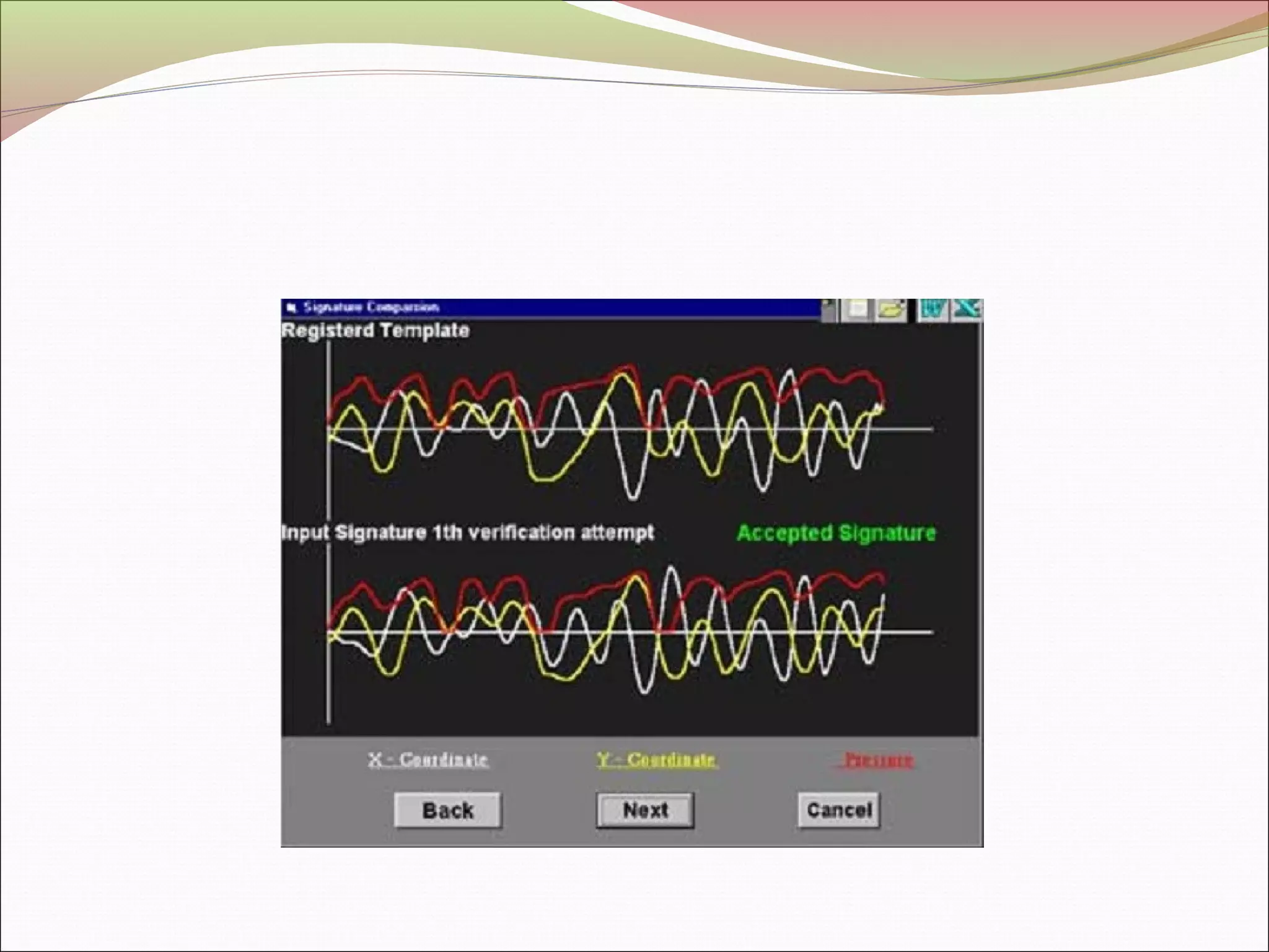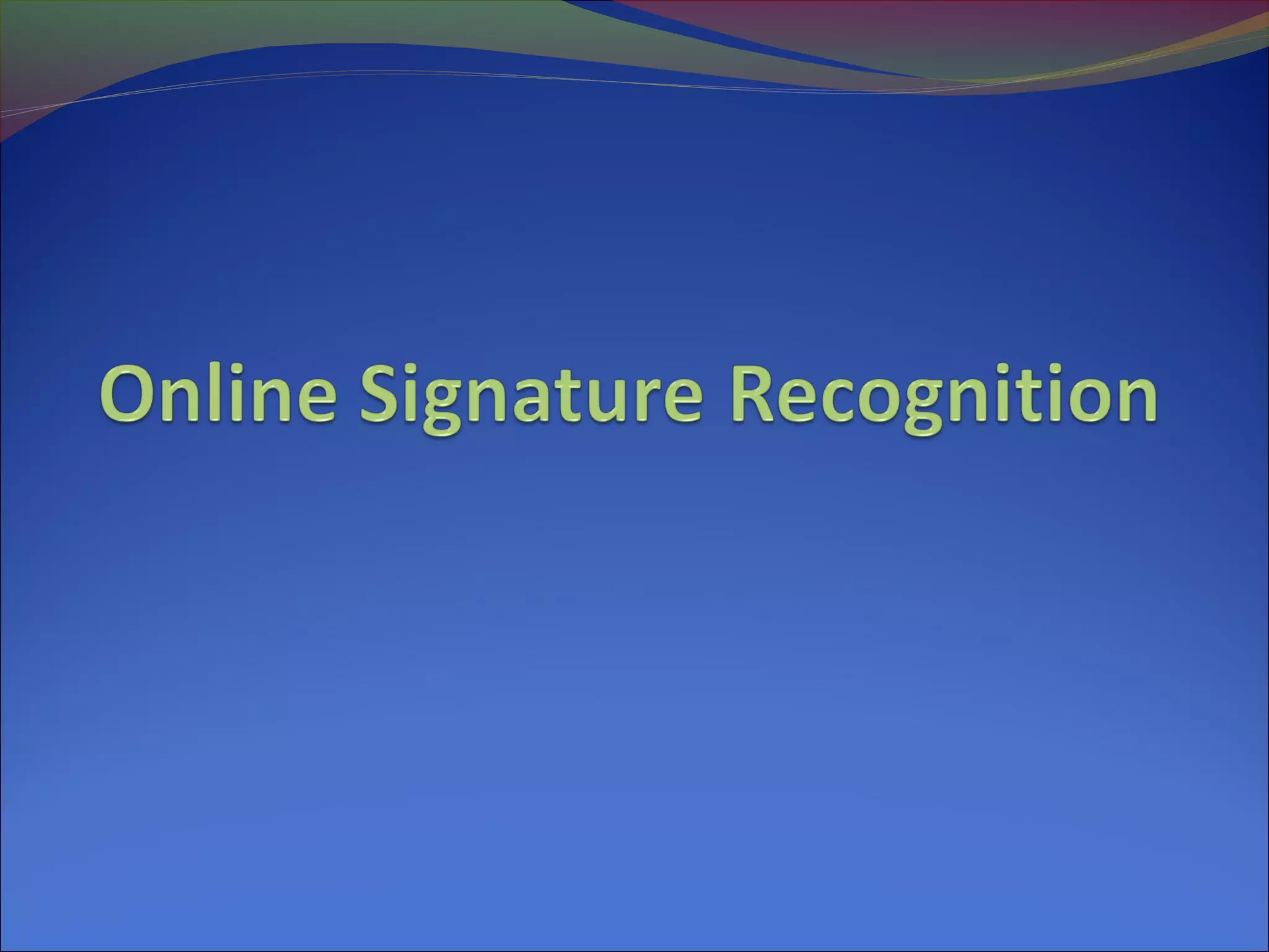 This document discusses signature recognition as a biometric for identity verification. It defines offline and online signatures, and describes how pen tablets digitize dynamic signatures. The document outlines the key steps of signature recognition systems, including pre-processing, feature extraction of local and global traits, modeling signatures, and detecting forgeries. It notes advantages of signatures being intuitive and independent of language, but also challenges around hardware costs and inconsistent writing abilities.