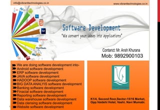 This document provides an introduction to software engineering. It discusses key topics like the definition of software engineering, differences between software engineering and computer science, the software development process, methods and costs of software engineering, professional responsibilities, and ethics in the field. The document is from a company called Vibrant Technologies and contains contact information throughout.