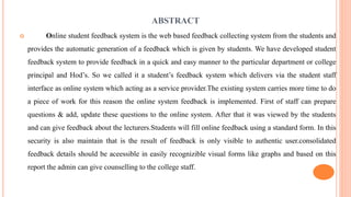The document describes an online student feedback system project created by students to allow for electronic collection and analysis of feedback from students on faculty performance. Key points include: