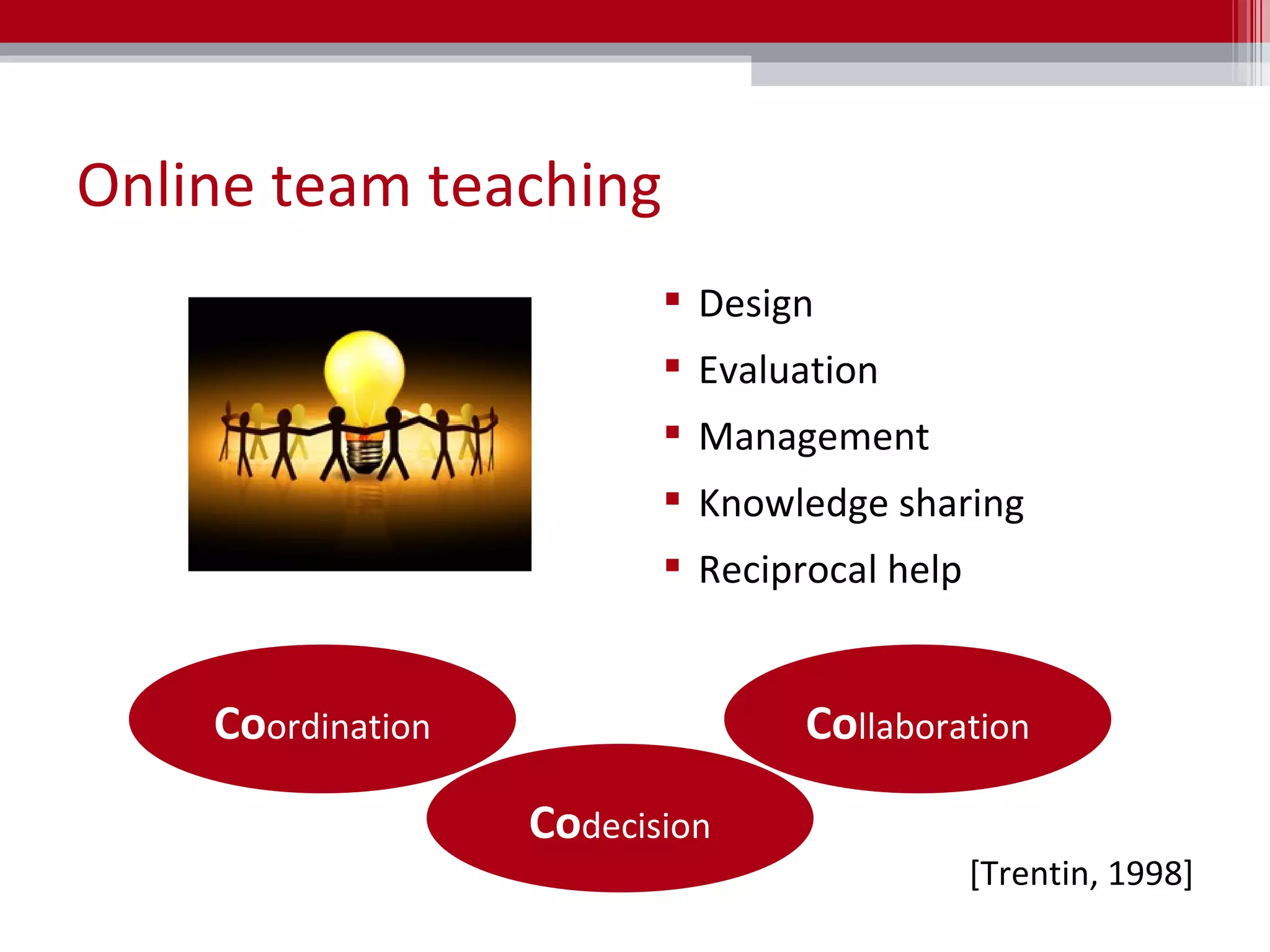 The document discusses the implementation of team teaching in online environments, including synchronous and asynchronous methods supported by digital tools. It emphasizes the importance of effective communication, collaboration, and the roles of teachers in facilitating learning through various pedagogical models. Additionally, it highlights the need for thorough planning, coordination, and the establishment of a collaborative culture among educators.