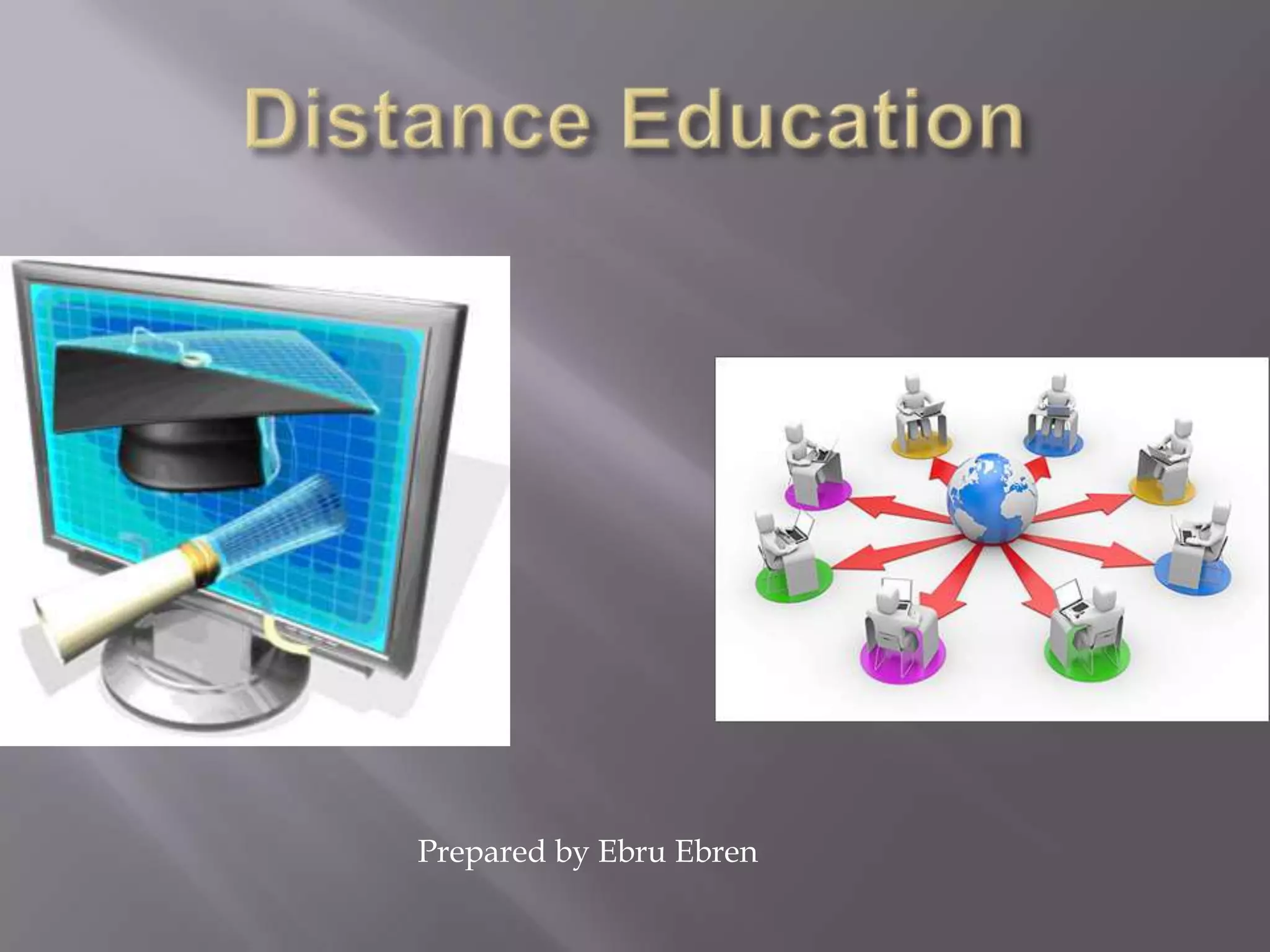Distance education involves teaching students who are separated from instructors, using technology like computers, internet, and software. It allows flexible self-paced learning from anywhere with many school choices. Benefits include saving time/money and gaining computer skills, but drawbacks are lack of social interaction and adaptability challenges. Effective distance education requires addressing different teaching challenges than traditional classrooms and can evaluate outcomes, efficiency, activities, program aims, policies, and organizational measures.