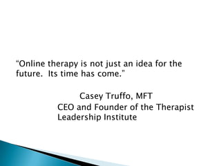 The document discusses the emergence of e-therapy, highlighting its capacity to provide accessible mental health services through technology for individuals facing various barriers to traditional therapy. It outlines the benefits and challenges of online counseling, emphasizing convenience, anonymity, and the potential for increased client disclosure, while also addressing legal, ethical, and training considerations for practitioners. The content underscores the effectiveness of e-therapy and the importance of adequate preparation and client assessment for successful treatment outcomes.