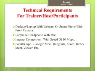 The document provides technical requirements and guidelines for trainers, participants, and hosts for online training sessions using video conferencing apps like Google Meet, Zoom, and Webex. It outlines requirements for equipment, internet connection speeds, setting up the online environment, how to use app features during sessions, troubleshooting technical issues, and contact information for queries.