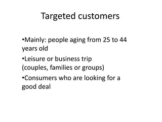 Booking.com targets customers aged 25 to 44 looking for leisure or business trips. It allows users to search and filter hotels by stars, amenities, and location. Users can read reviews from past travelers, view photos and maps, and book hotels directly on the site. While Expedia offers more services like flights and cars, Booking.com focuses only on hotels and provides more contextual information about nearby attractions. It aims to guide users to highly reviewed hotels and shows recent bookings of searched properties.