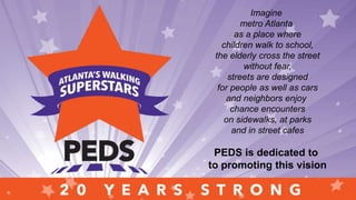 This document summarizes the progress that has been made over the past two decades to make Atlanta more walkable and pedestrian-friendly. It recognizes organizations and programs like PEDS, Midtown Alliance, Livable Centers Initiative, and cities like Decatur that have helped promote walkability through projects improving street design, increasing funding for safety improvements, expanding the safety toolkit, and creating vibrant, mixed-use places worth walking to. It also celebrates the increased awareness, policies, partnerships and other advances that have helped transform Atlanta from a car-centric city to one where walking is becoming more mainstream.