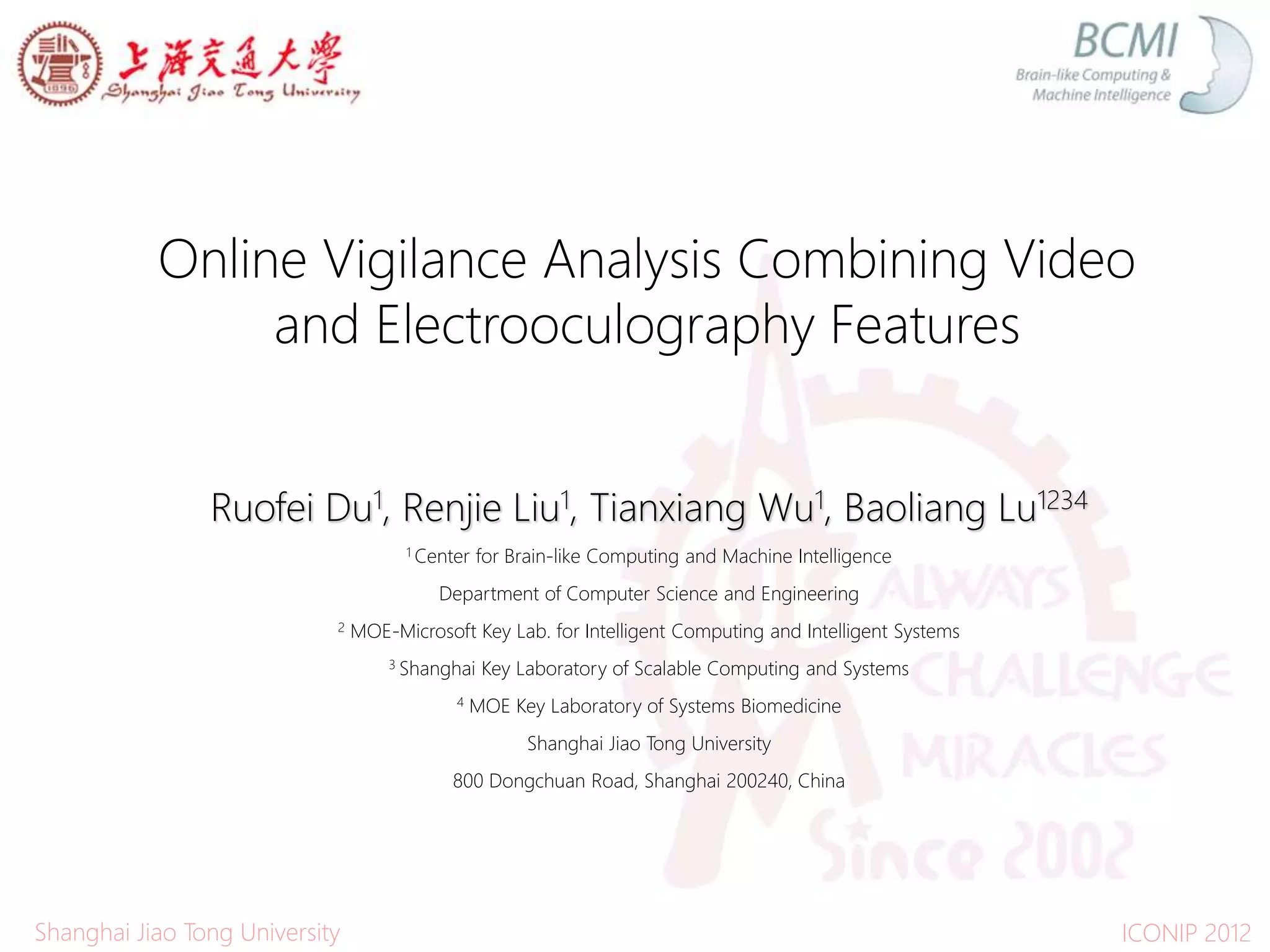 The document discusses the development of a system for detecting driver drowsiness using video and electrooculography (EOG) features, motivated by the high incidence of traffic accidents caused by fatigued driving. The system incorporates features such as eye movement, yawn state, and facial orientation for analysis, along with processing EOG signals to improve accuracy. Future work aims to enhance robustness and introduce comprehensive features to further address driver vigilance.