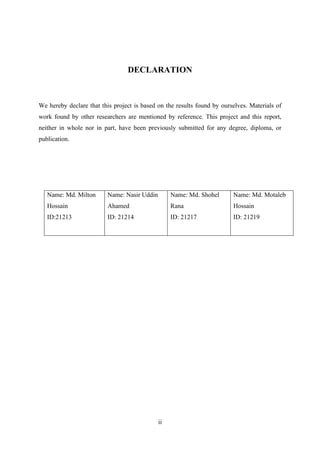 The document describes a project report submitted for a post graduate diploma in information technology on the design and development of an online voting system (OVS). It includes declarations by the student authors, a certificate from their supervisor, an abstract describing the OVS, and a table of contents outlining the contents of the report.