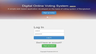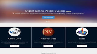 The document presents a digital online voting system based on the electoral system of Bangladesh, emphasizing simplicity and productivity. It highlights limitations of the current voting system, including insecurity and inaccessibility, while proposing a robust and secure online solution with real-time data updates and mobile compatibility. The system employs various technologies like JavaScript, Meteor.js, and MongoDB, and aims to enhance user experience through features such as latency compensation and support for social media logins.